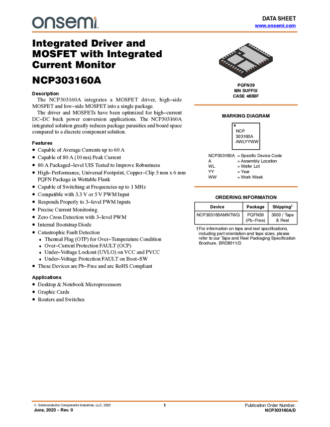 NCP303160A Integrated Driver and MOSFET with Integrated Current Monitor, 60A