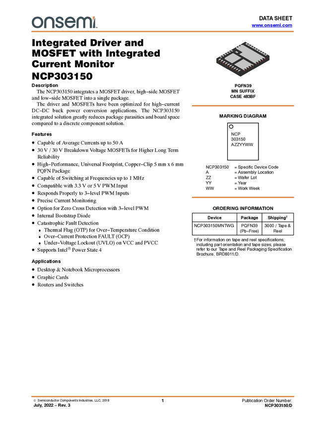 NCP303150 Integrated Driver and MOSFET with Integrated Current Monitor