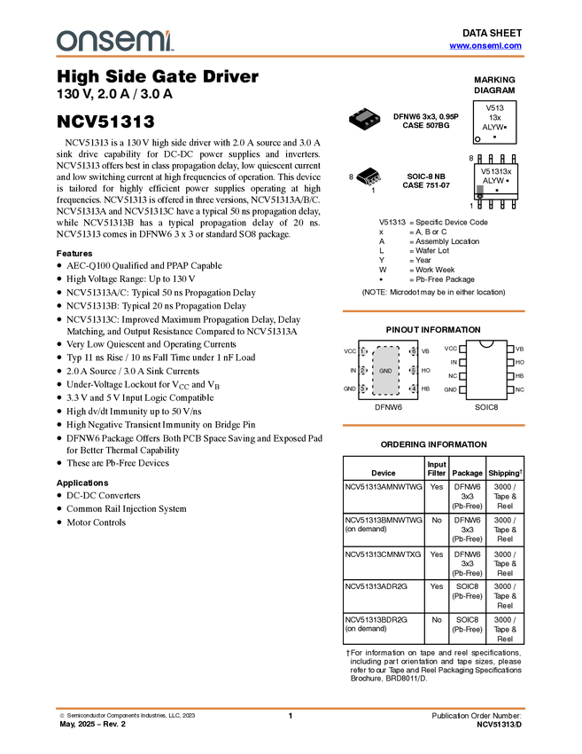 NCV51313 Automotive High Side Gate Driver, 130 V, 2.0 A / 3.0 A