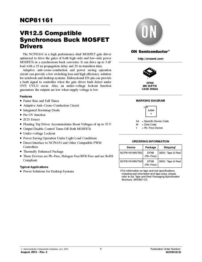 NCP81161 MOSFET Driver, VR12.5 Compatible, Synchronous Buck