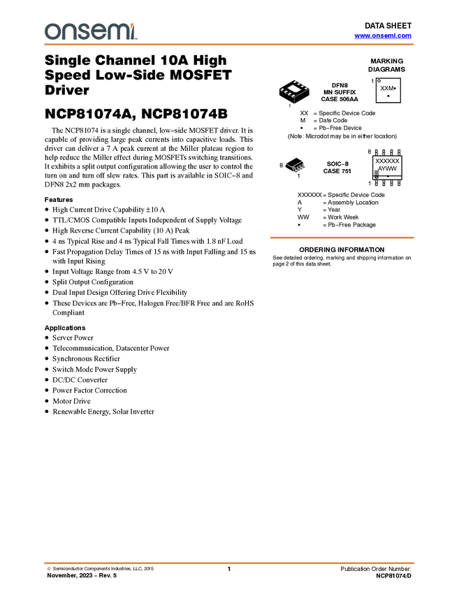 NCP81074 Small, High Speed Low Side MOSFET Driver with 10A sink/source capability