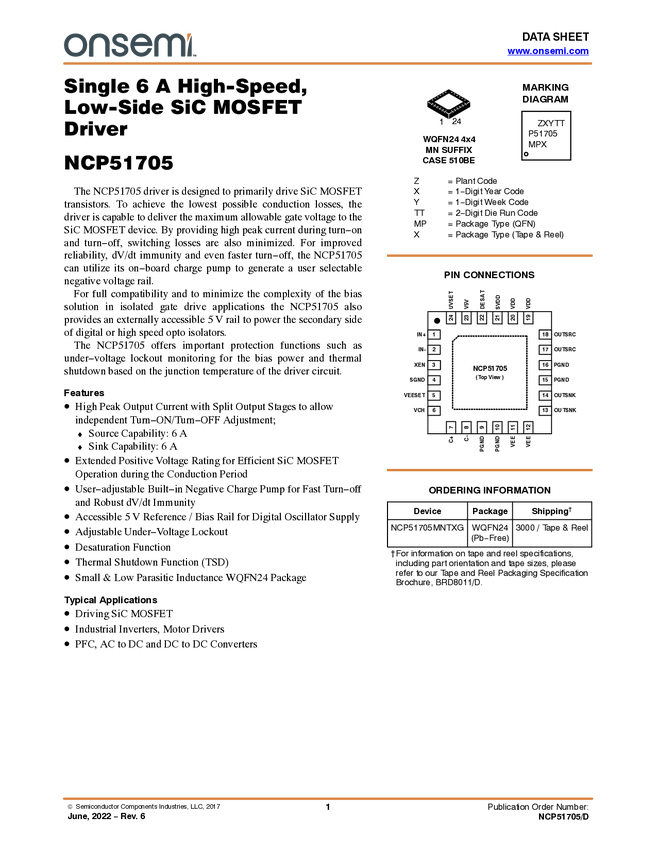NCP51705 SiC MOSFET Driver, Low-Side, Single 6 A High-Speed