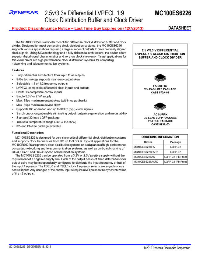 MC100ES6226AC 2.5V/3.3V Differential LVPECL 1:9 Clock Distribution Buffer And Clock Drive...