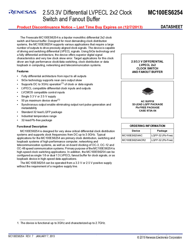 MC100ES6254AC 2.5V/3.3V Differential LVPECL 2x2 Clock Switch And Fanout Buffer