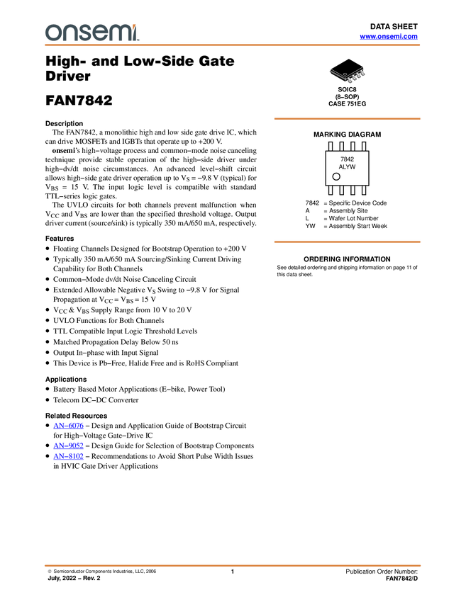 FAN7842 225V,TTL input logic compatible 0.65/0.35A sink/source current, High & Low...