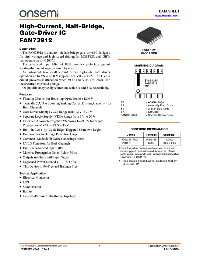 FAN73912 1200V High-Current, Half-Bridge, Gate-Driver IC (HVIC)