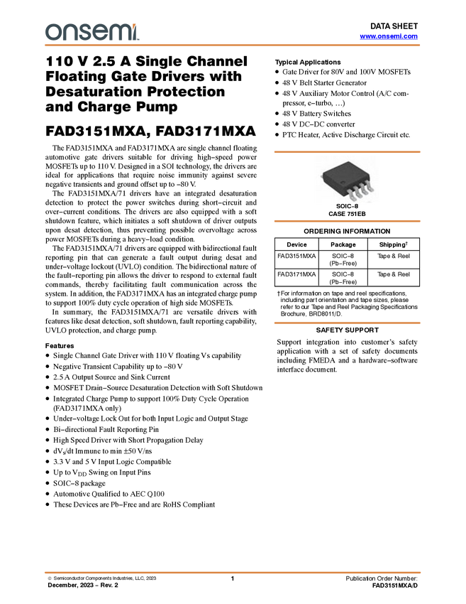 FAD3171MXA 110V, 2.5A, SOIC-8, Single Channel Floating Gate Drivers with Desaturation...