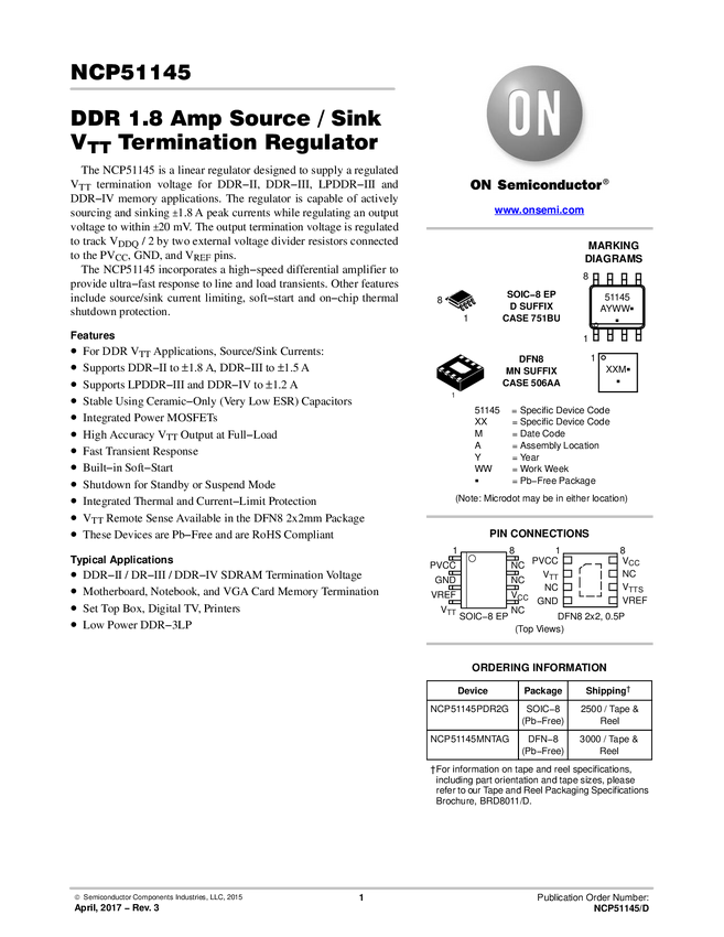 NCP51145 1.8A Source / Sink VTT DDR Termination Regulator