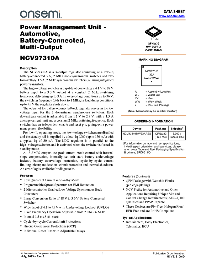 NCV97310A Multi-output Power Management Unit (PMU) with 3 Buck Regulators