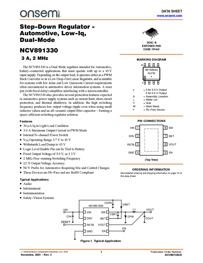 NCV891330 3 A, 2 MHz Low-I<sub>q Dual-Mode Step-Down Regulator for Automotive