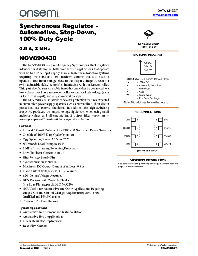 NCV890430 Automotive 0.6 A 2 MHz 100% Duty Cycle Step-Down Synchronous Regulator
