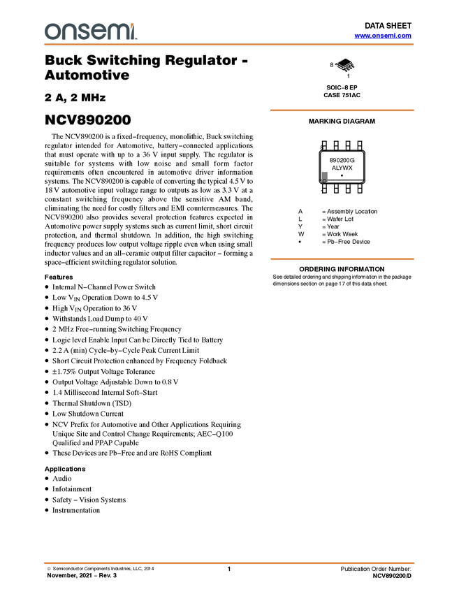 NCV890200 Automotive Switching Regulator, Buck, 2 A, 2 MHz