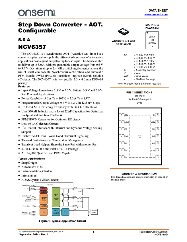 NCV6357 Synchronous Buck Converter, Processor Supply, I2C Programming, 5.0 A
