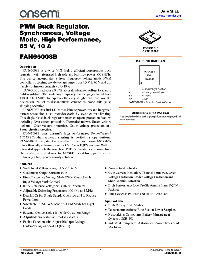FAN65008B Synchronous PWM Buck Regulator, High Performance, Voltage Mode, 65 V, 10 A