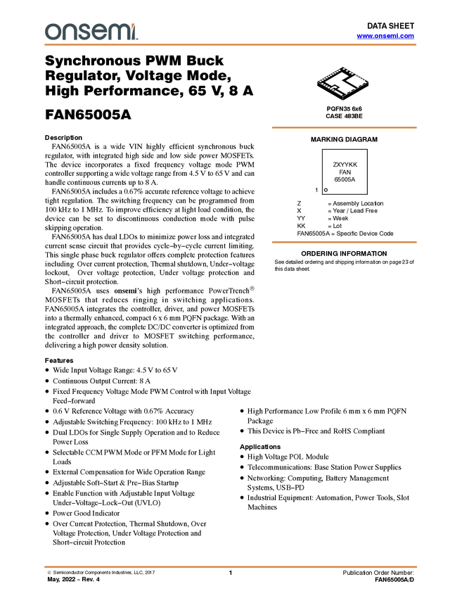 FAN65005A Synchronous PWM Buck Regulator, High Performance, Voltage Mode, 65 V, 8 A