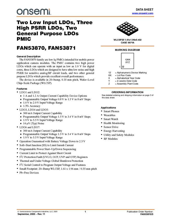 FAN53870 Two Low Input LDOs, Three High PSRR LDOs, Two General Purpose LDOs PMIC