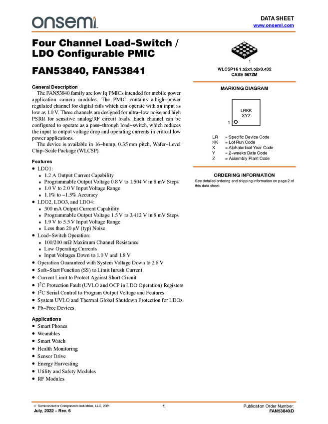 FAN53840 Four Channel Load-Switch/LDO Configurable PMIC
