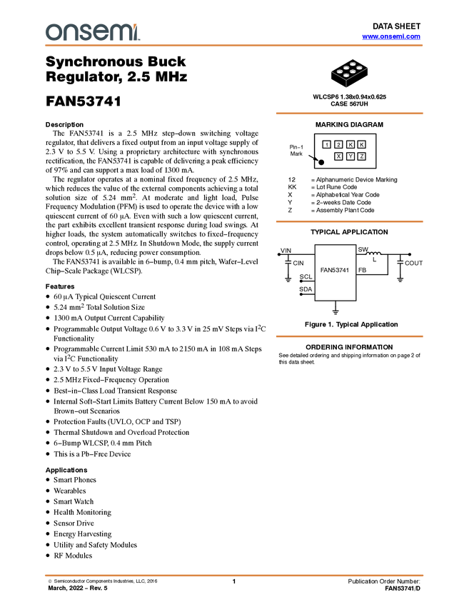 FAN53741 1.3A Synchronous buck Regulator with I2C interface