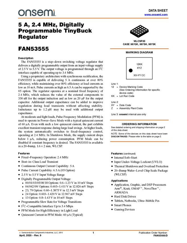 FAN53555 5 A, 2.4 MHz, Digitally Programmable TinyBuck™ Regulator