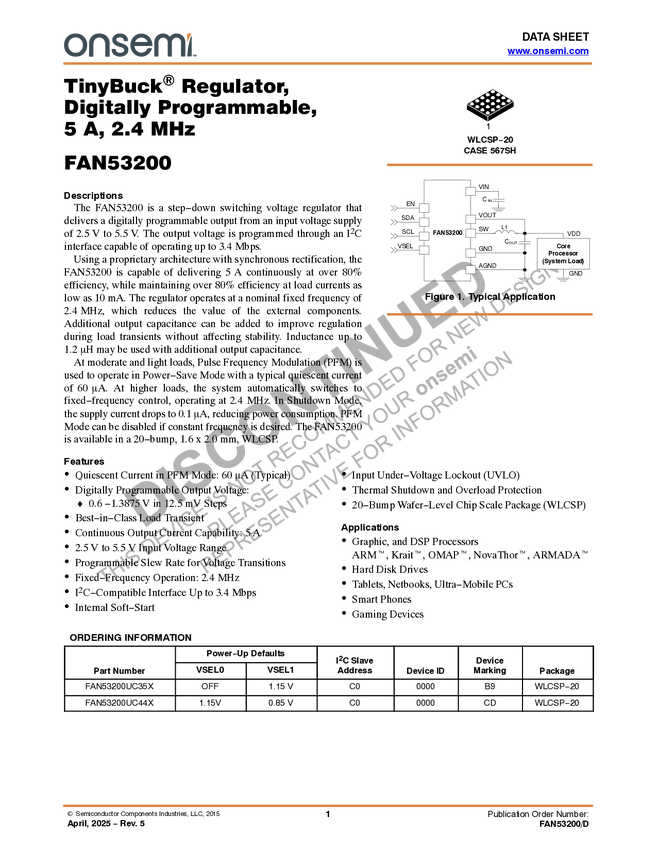 FAN53200 5A, 2.4 MHz, Digitally Programmable TinyBuck® Regulator
