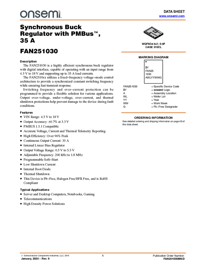 FAN251030 35A Synchronous Buck Regulator with PMBUS