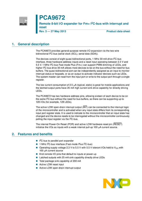 PCA9672BS Remote 8-bit I/O expander for Fm+ I2C-bus with interrupt and reset