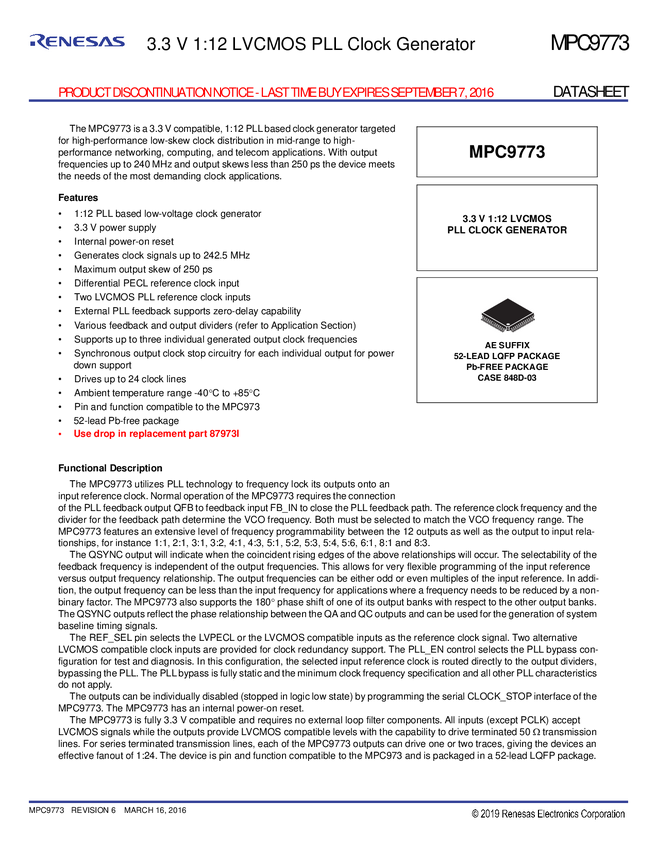MPC9773AE 3.3V 1:12 LVCMOS PLL Clock Generator