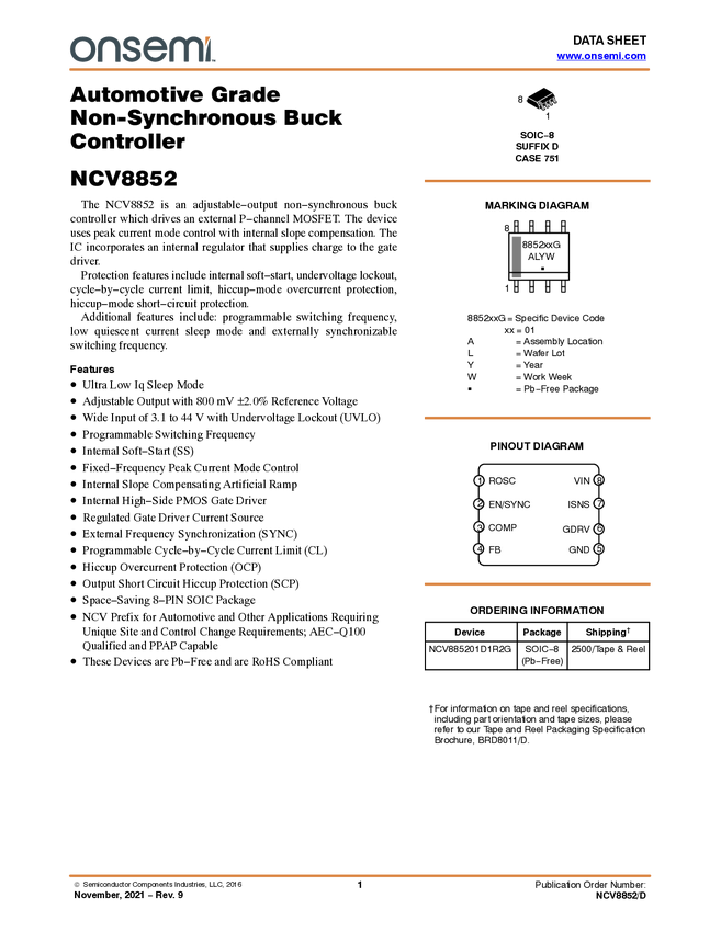 NCV8852 P-Channel, 100% Duty Cycle, Non-Synchronous Buck Controller, Automotive Gra...