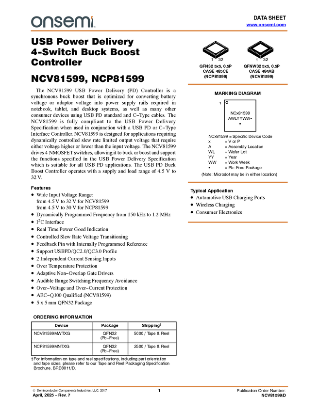 NCP81599 I2C Configurable, 4-Switch Buck Boost Controller for USB-PD Power Delivery...