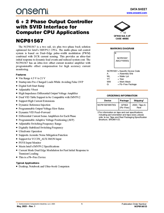 NCP81567 6+2 Phase Output Controller with SVID Interface for Computer CPU Applicatio...