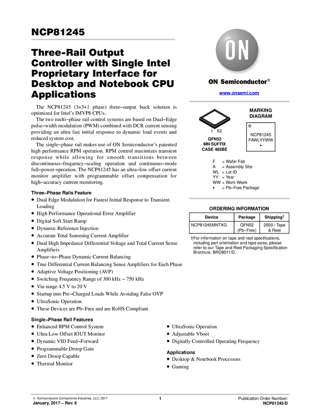 NCP81245 Three-Rail Output Controller, IMVP8 Compatible