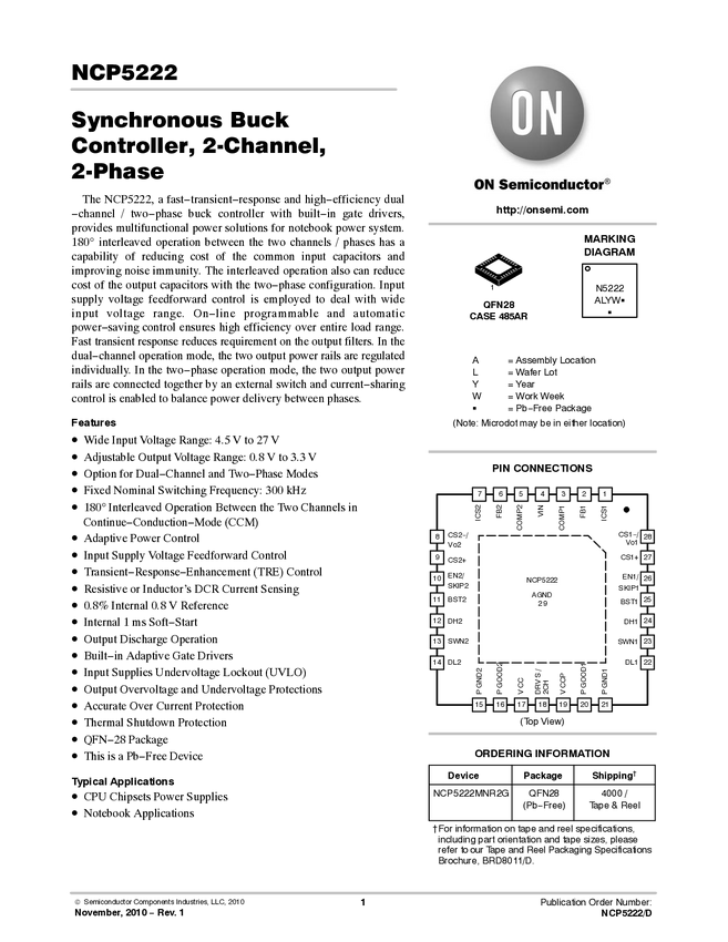 NCP5222 Synchronous Buck Controller, 2-Channel, 2-Phase