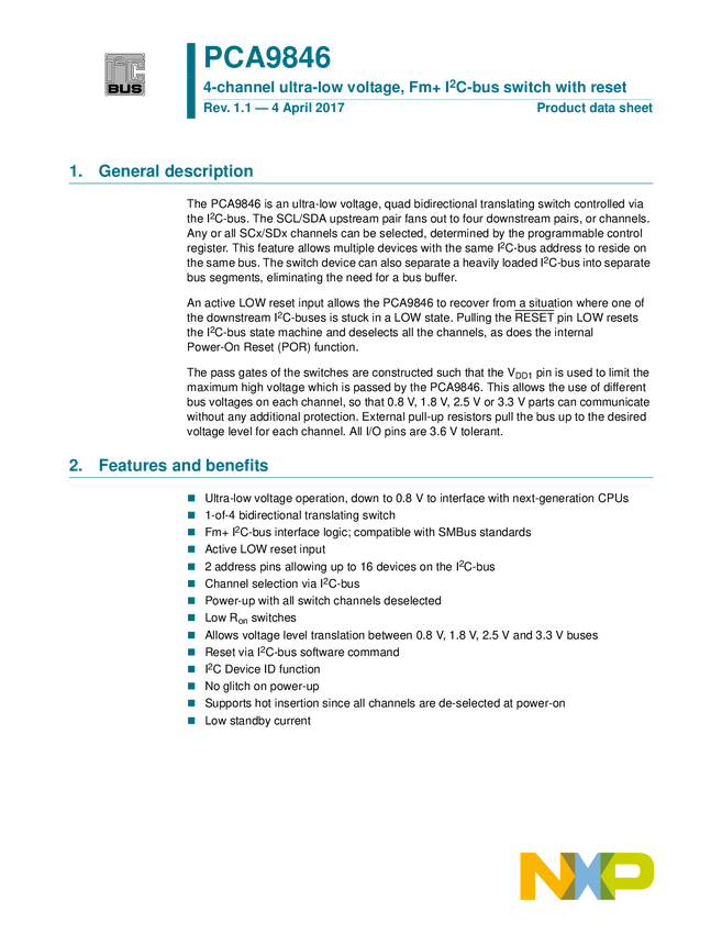 PCA9846PW 4-channel ultra-low voltage, Fm+ I2C-bus switch with reset