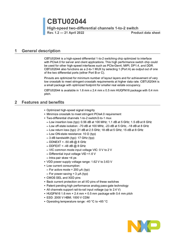CBTU02044HE High-speed two-differential channels 1-to-2 switch for PCIe Gen4