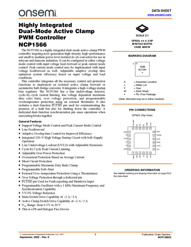 NCP1566 Highly Integrated Dual-Mode Active Clamp PWM Controller