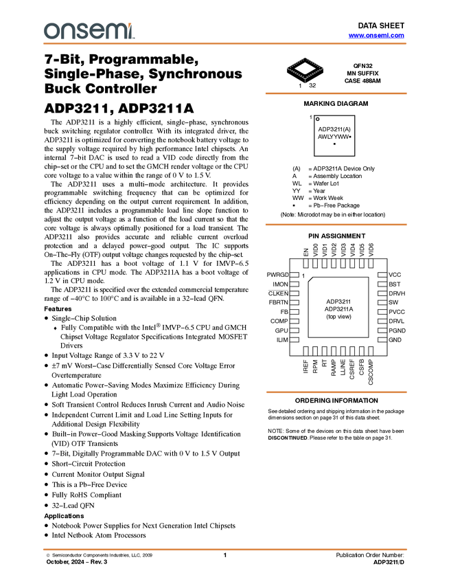 ADP3211 Synchronous Buck Controller, 7-Bit, Programmable, Single-Phase