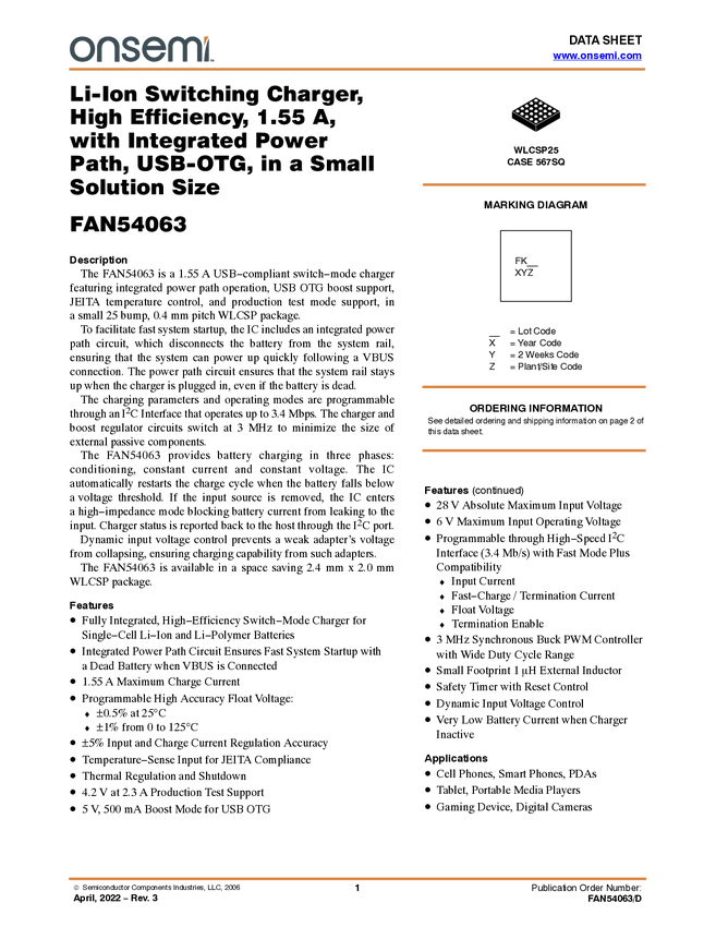 FAN54063 Battery Charge Controller, Switching, 1.6 A, with Integrated Power Path and...
