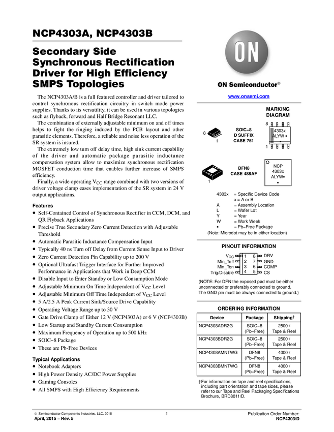 NCP4303 Secondary Side Controller, Synchronous Rectification, for High Efficiency S...