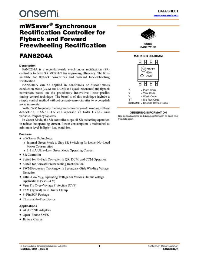 FAN6204A mWSaver™ Synchronous Rectification Controller for Flyback and Forward Freew...