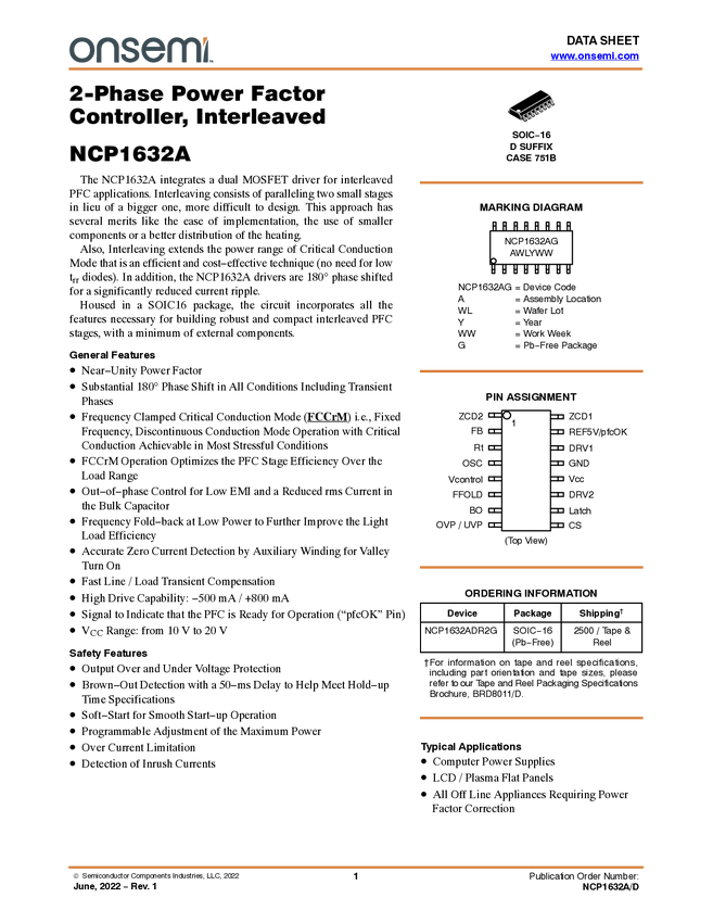 NCP1632A Critical Conduction Mode (CrM) Power Factor Controller, Interleaved