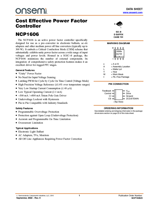 NCP1606 Critical Conduction Mode Power Factor Correction Controller