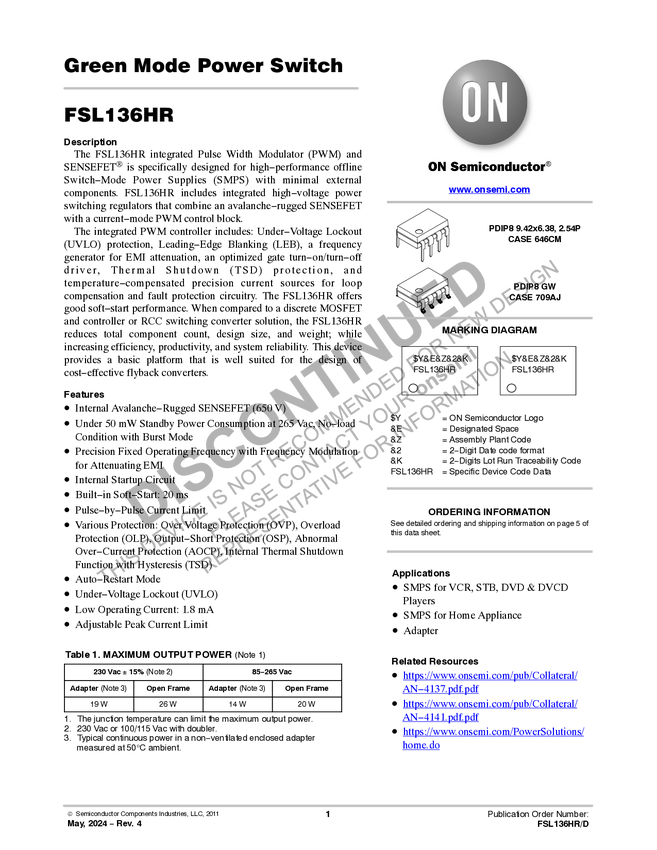 FSL136HR 650V Integrated Power Switch with 100kHz frequency and adjustable current l...