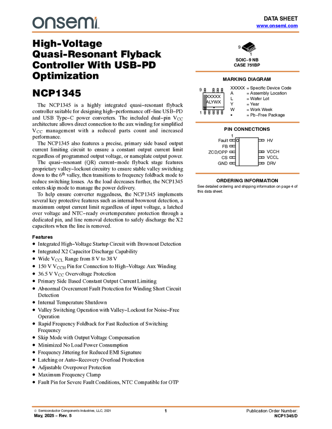 NCP1345 Highly integrated quasi-resonant flyback controller for off-line USB-PD and...
