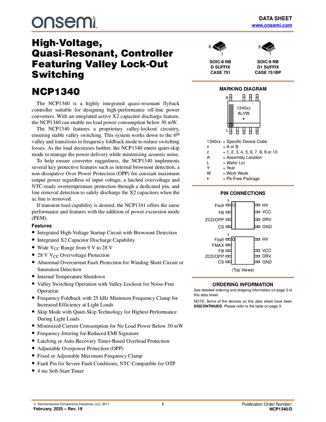 NCP1340 Quasi-Resonant Controller, High-Voltage, Featuring Valley Lock-Out Switchin...