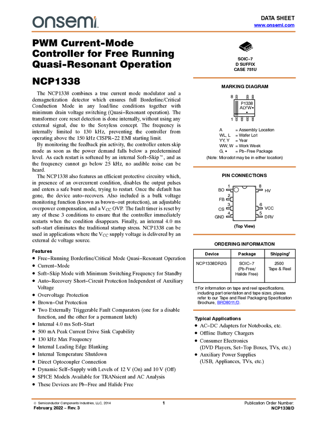 NCP1338 PWM Controller, Free Running Quasi-Resonant Current Mode