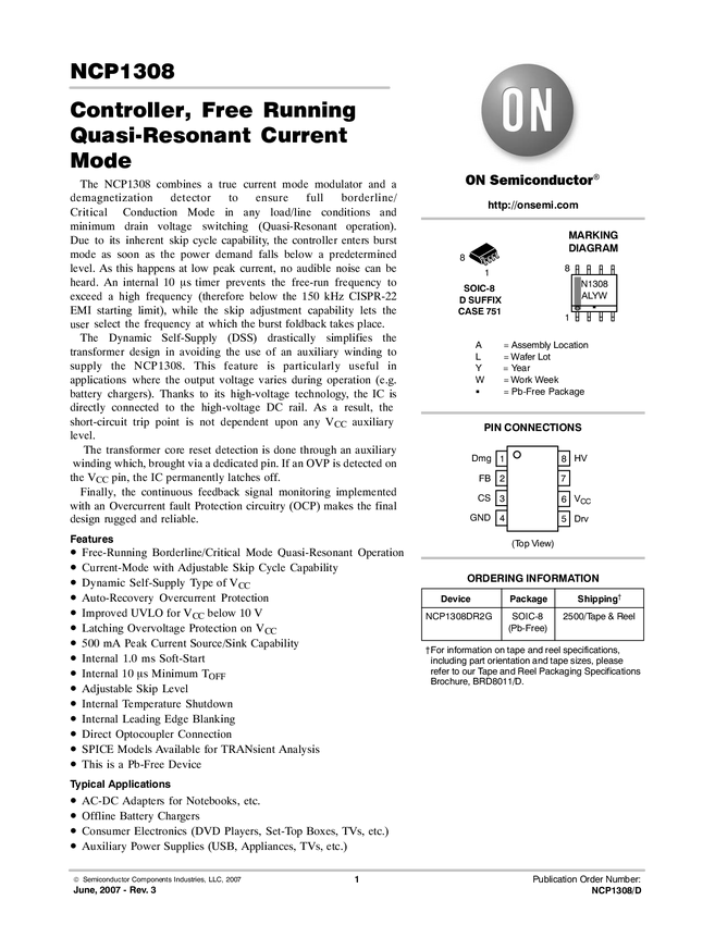 NCP1308 Controller, Free Running Quasi-Resonant Current Mode
