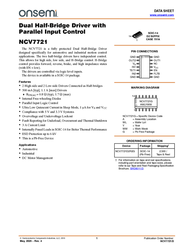 NCV7721 Motor Driver, Double Half-Bridge with Direct Control
