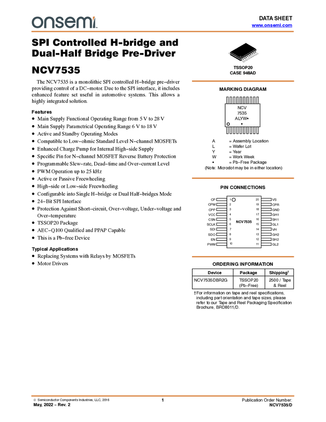NCV7535 FLEXMOS™ SPI controlled H-bridge and Dual-Half Bridge pre-driver