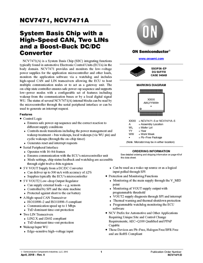 NCV7471 System Basis Chip with Dual LIN, HS CAN and 500 mA Boost-Buck DC-DC