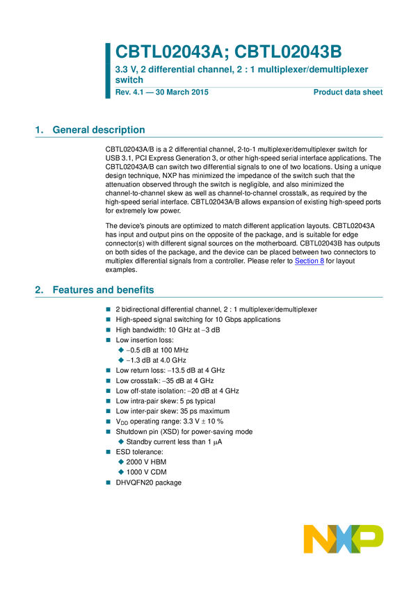 CBTL02043ABQ 3.3 V, 2 differential channel, 2 : 1 multiplexer/demultiplexer switch